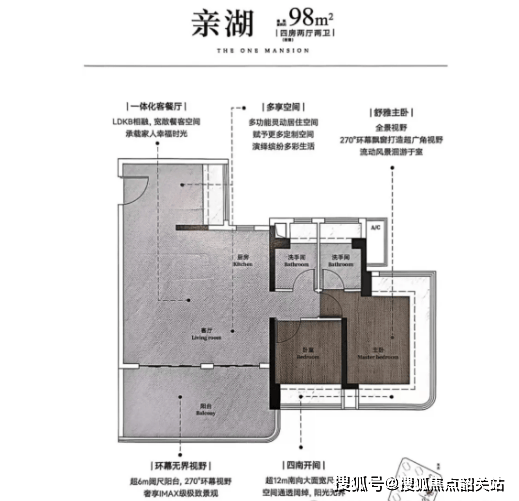 建面 98 平 3+1 房两卫,具有超 50 平风雅厅,最大楼间距可达 150 米摆布,